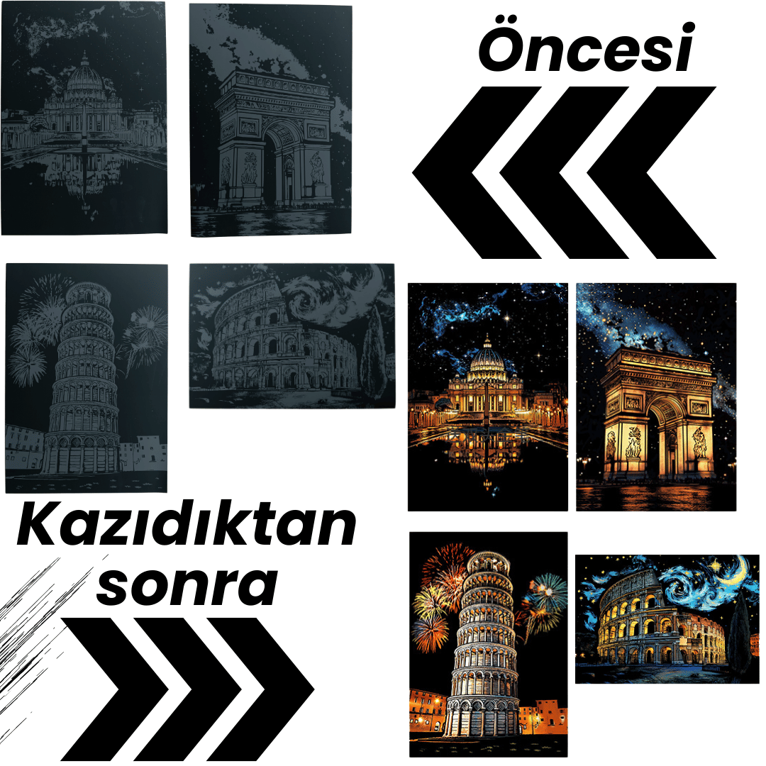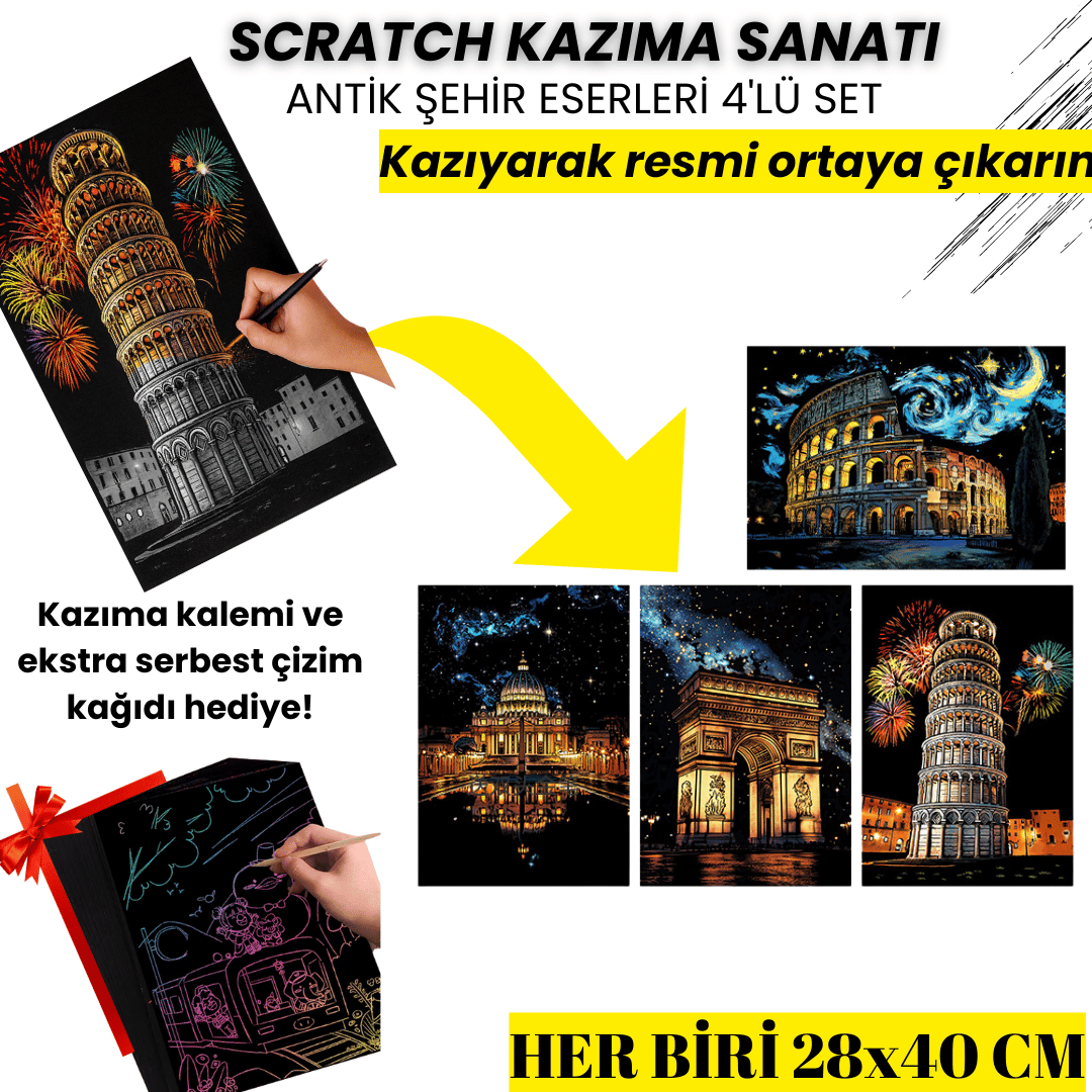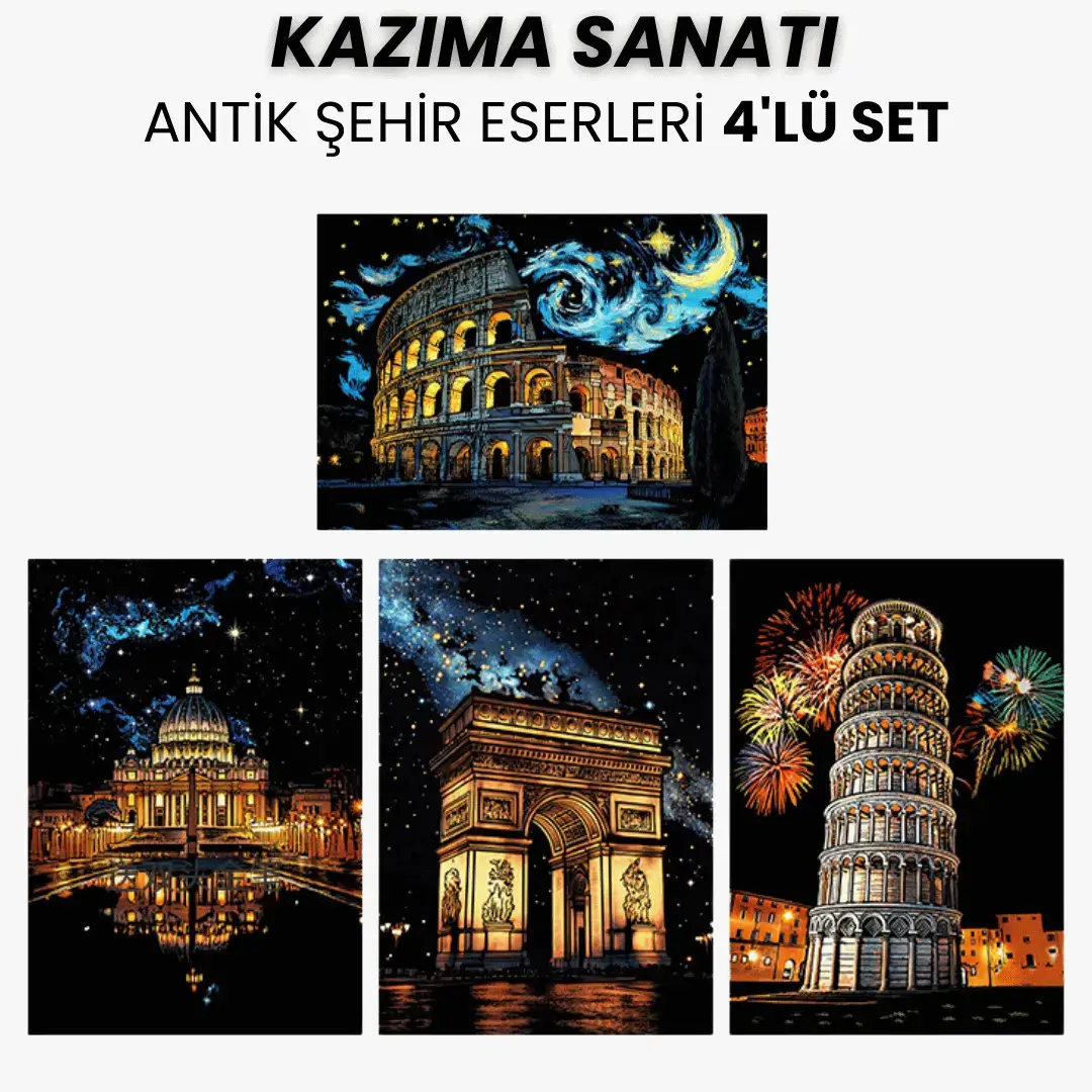 Scratch Kazıma Sanatı | Kazıyarak Çizim Seti | Antik Şehir Eserleri 4’lü Set | 28×40 cm – A3 Kazıma Kağıdı