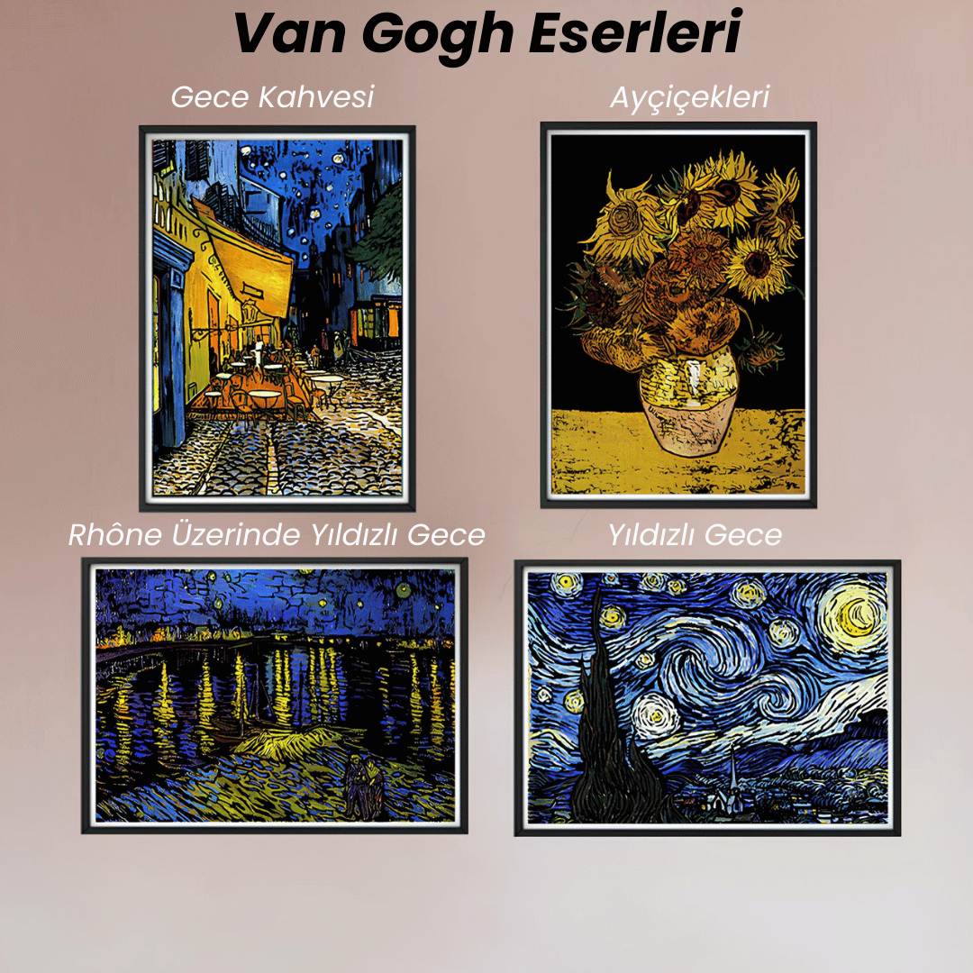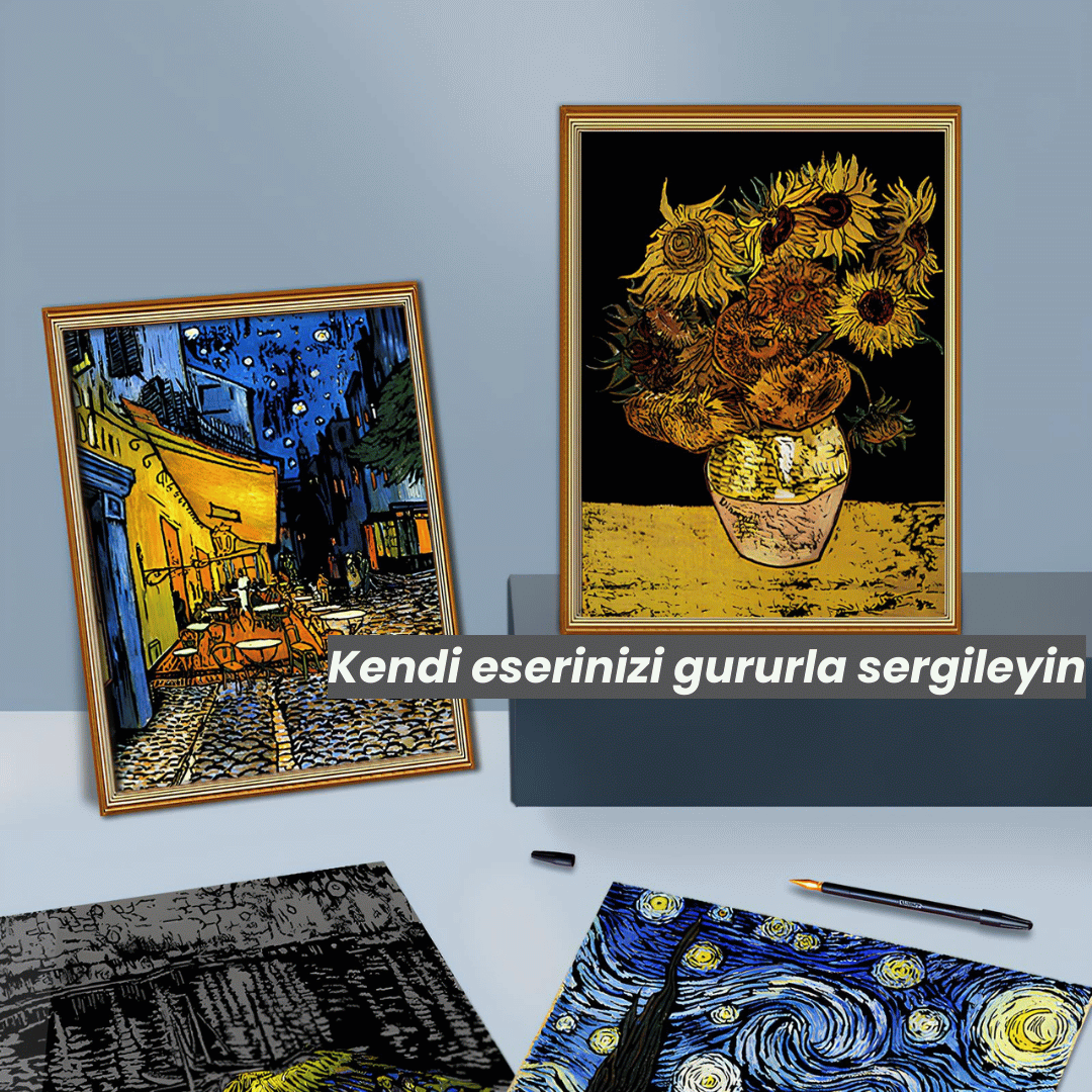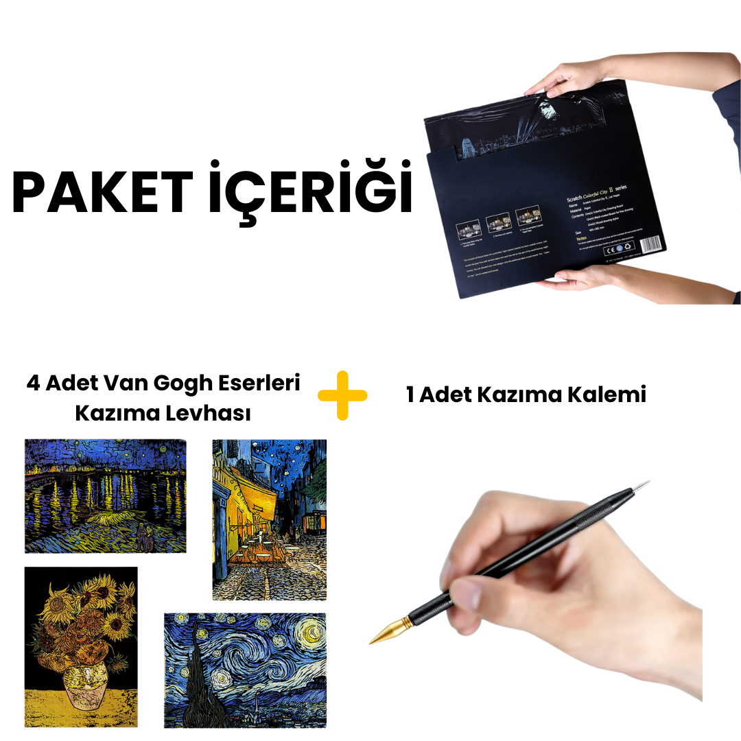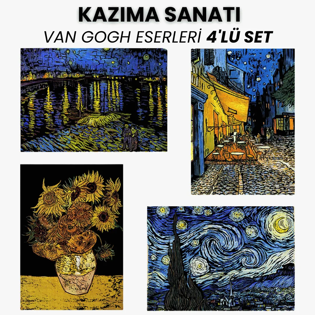 Sanat tarihinin en unutulmaz tablolarını kendi el emeğinizle ortaya çıkarmak ister misiniz? Scratch Kazıma Sanatı – Van Gogh Eserleri 4’lü Set, siyah yüzeyi özel kazıma kalemiyle kazıyarak Vincent van Gogh’un büyüleyici tablolarını yeniden yaratmanıza imkan tanır.