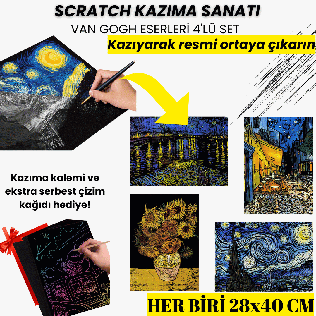 Scratch Kazıma Sanatı | Kazıyarak Çizim Seti | Van Gogh Eserleri 4’lü Set | 28×40 cm – A3